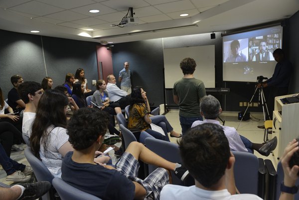 Os jornalistas Guga Chacra e Ariel Palacios conversam ao vivo com alunos do Peretz.
