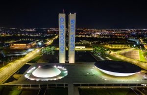 As torres do Congresso Nacional foram iluminadas nesta noite de domingo (5) com a frase "Holocausto Nunca...
