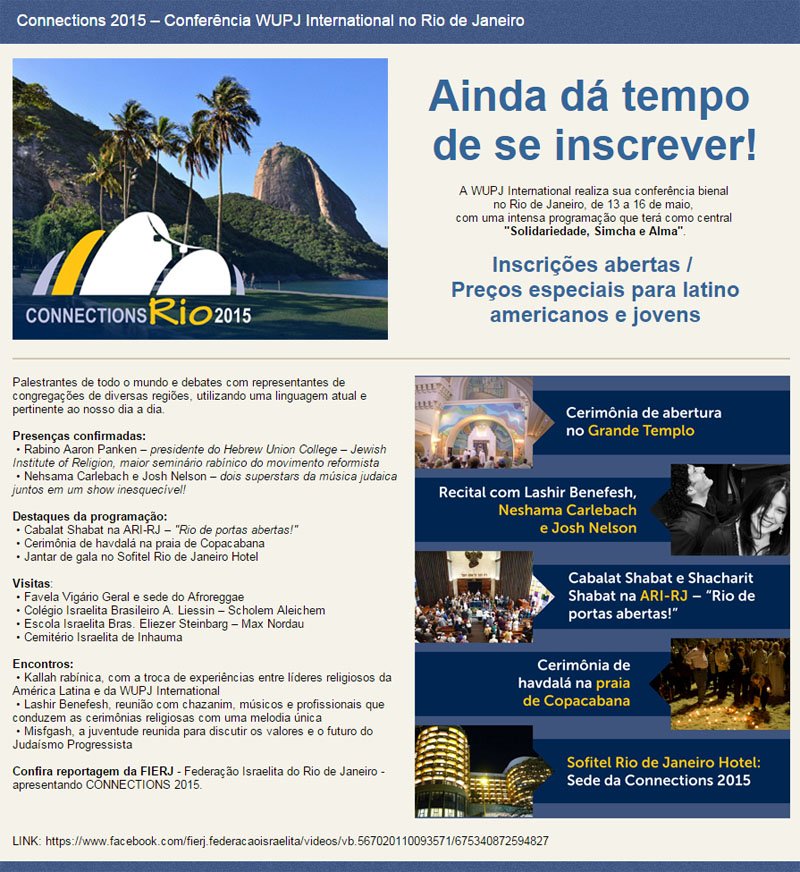 World Union for Progressive Judaism realiza conferência bienal Connections 2015 de 13 a 16 de maio com intensa programação sobre o judaísmo liberal.A World...
