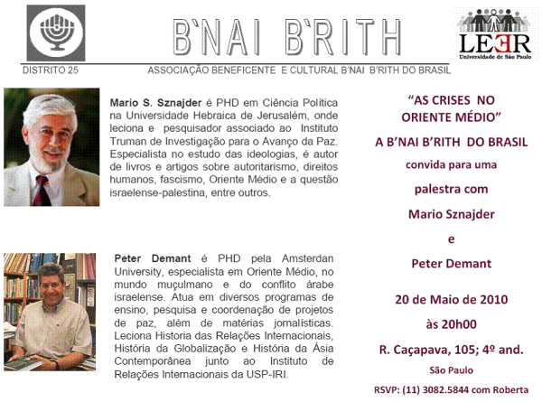 Debate com o Professor Mario Sznajder e os jornalistas Roberto Lameirinhas, Jaime Brener e Joseph Benarroch. Compareça!